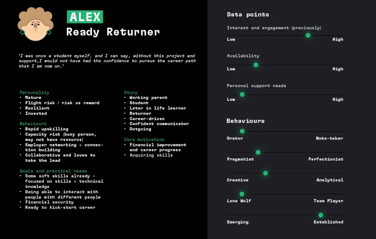 We identified two main Characteristics. First “Alex”, a persona who runs for the second time. She is more aware of what to expect and feels more comfortable in the process. Second persona was “Lexie” who is a first-time runner and is a bit more cautious and apprehensive about the project. This differentiation was very prominent in our interviews. Students that came back for a second round were more confident and outspoken.