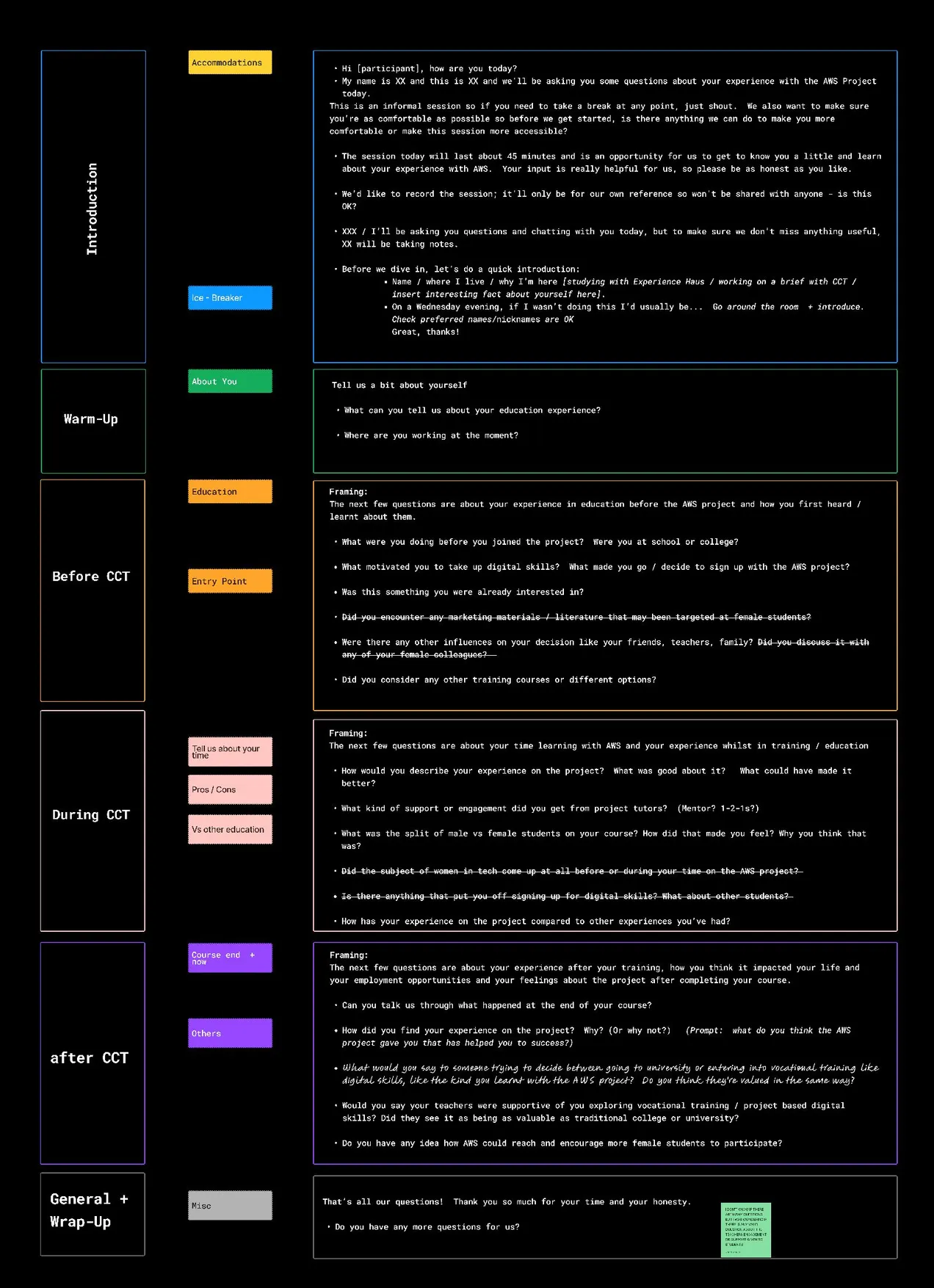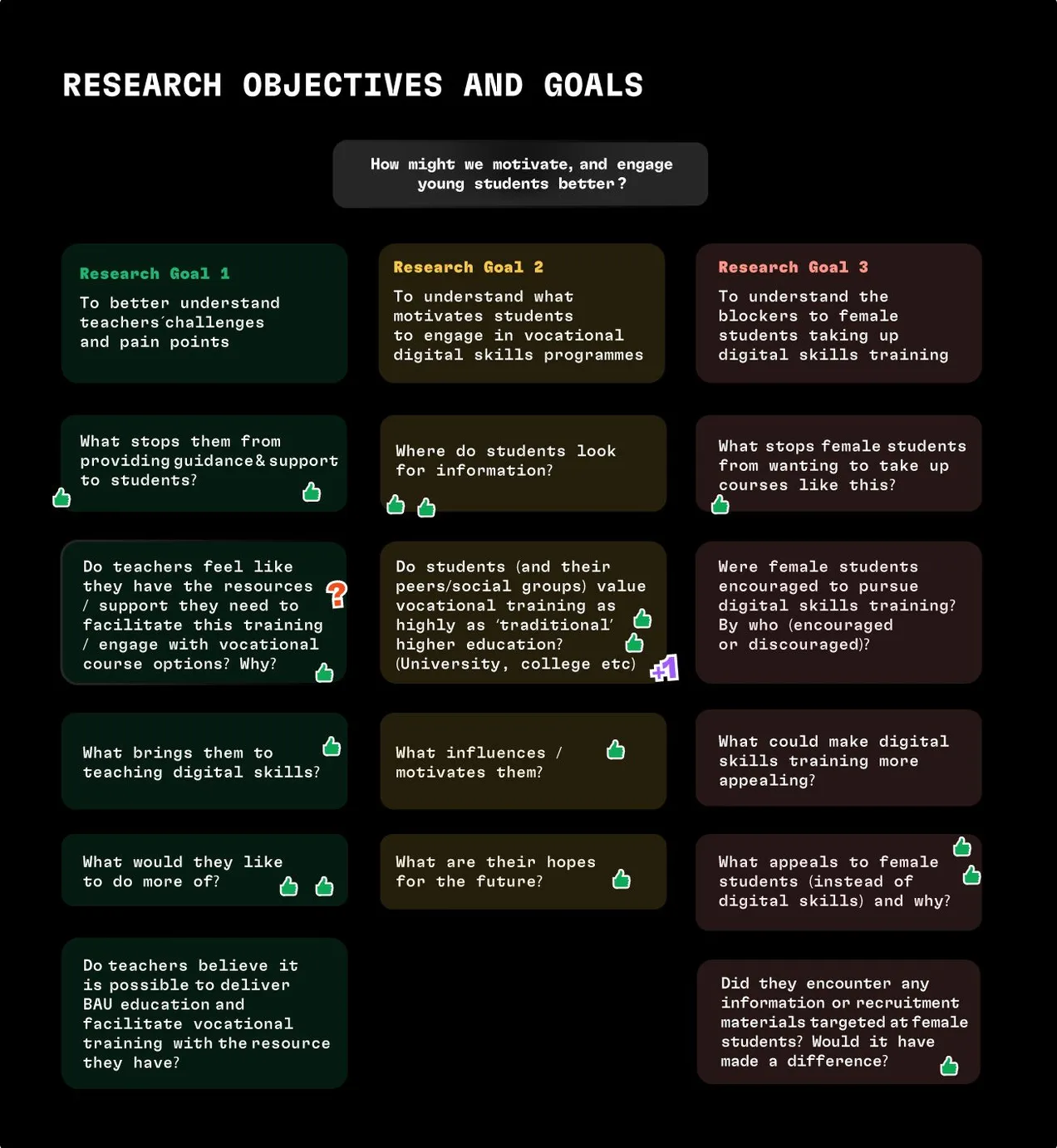 After the first batch of interviews we formulated Research Objectives, Goals and created a Research Plan. They were a good base for the second, more challenging, round of interviews. We wanted to hear the perspective of ppl who either didn’t have the best experience or didn’t finish the project. The objective was to extend our knowledge and to understand Students better. Especially their motivations to engage in vocational digital skills programs and particularly what are the blockers to female participants.