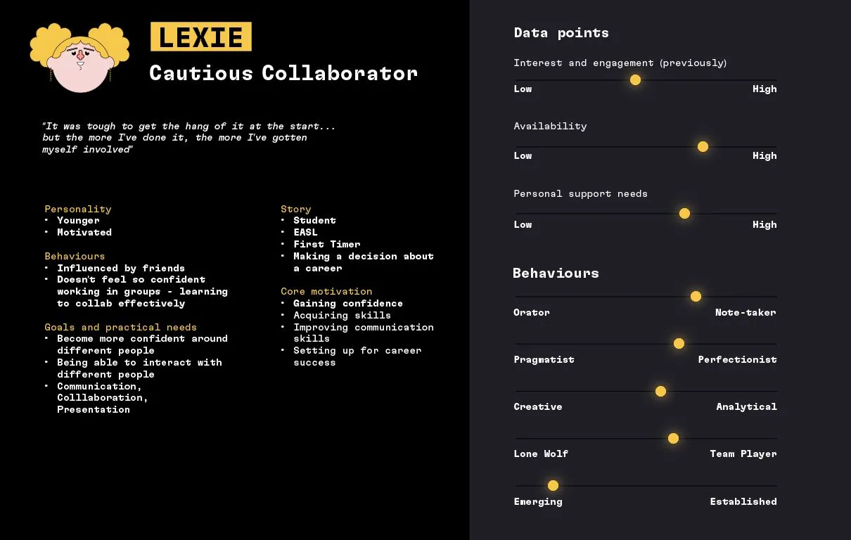 Restrained by the time we could only identify one path, so we decided to focus on “Lexie”. As first-time students had more problems with adaptation to the process, we prioritised their needs and focused mainly on their path.