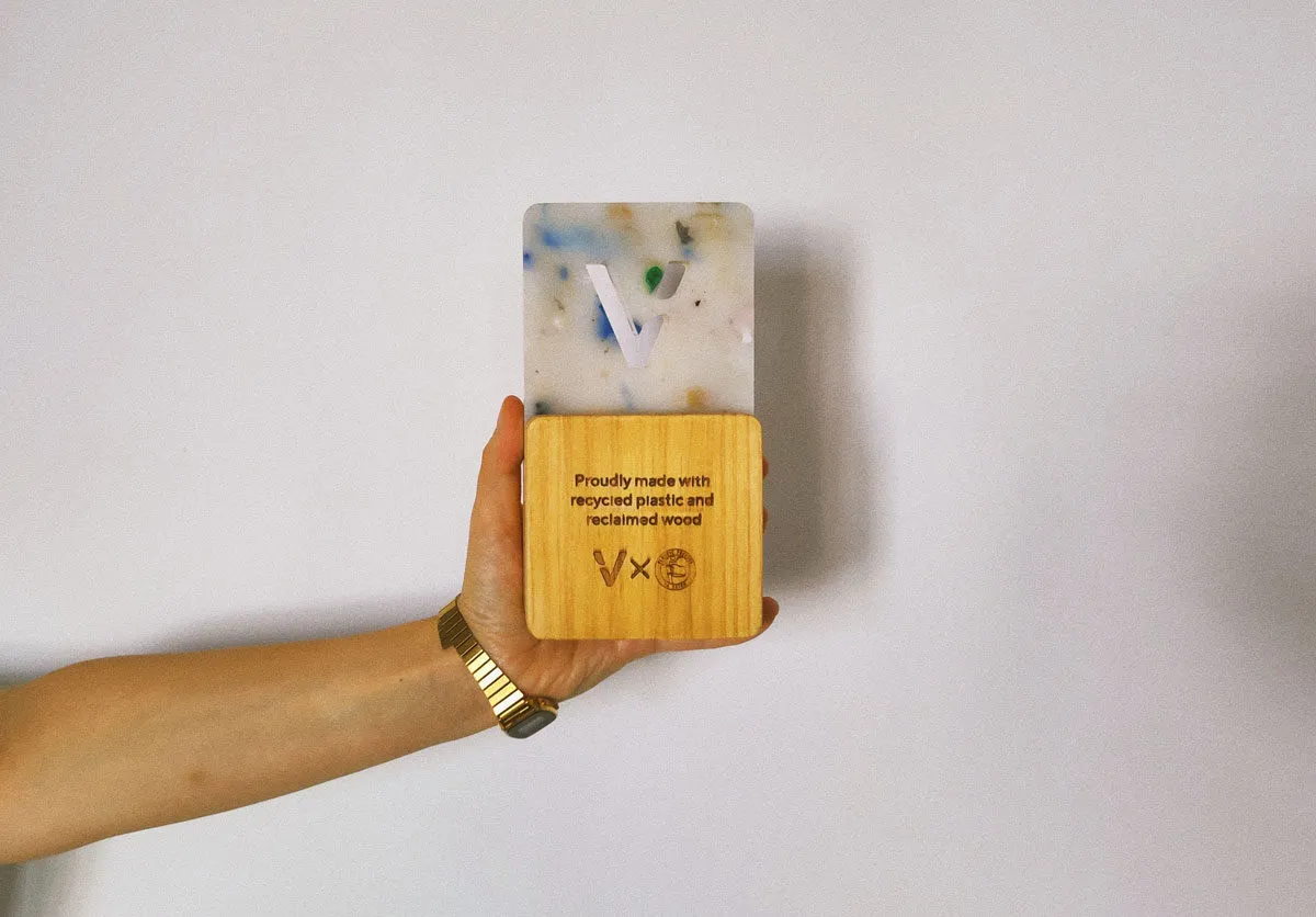 We agreed to try create something special for EcoVadis with different types and colours of recycled plastic. Sheet can be predominantly white (as we couldn’t achieve transparency with recycled materials that Precious plastic had available) with some colourful spots, specially green as it is ecovadis colour. On a call i found out also that we can use reclaimed wood and incorporate it in to my design. We can engrave it to and plastic can be shaped with laser cut. I started to draw different shapes and options. We agreed that the trophy needs to have some kind of element that will make it recognisable, something that will give the hint of ecovadis. I knew I wanted to use ecovadis”v” but wasn’t sure how.